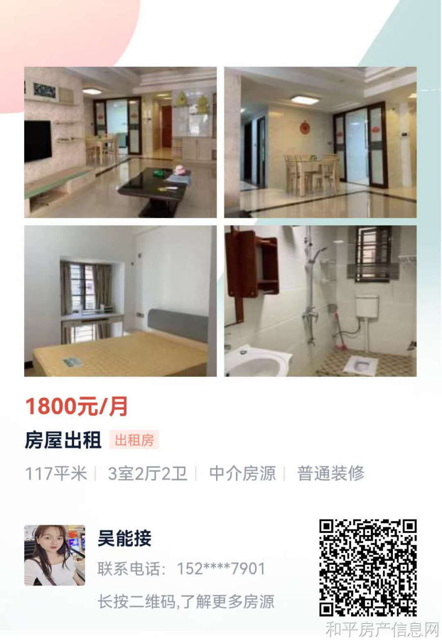 和平印象,电梯中高层朝南,3房2厅,保养新,拎包入住,月租2000元,联系13423993205